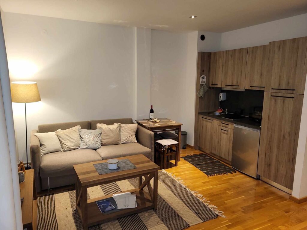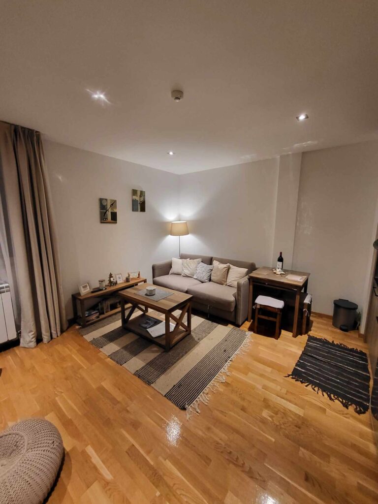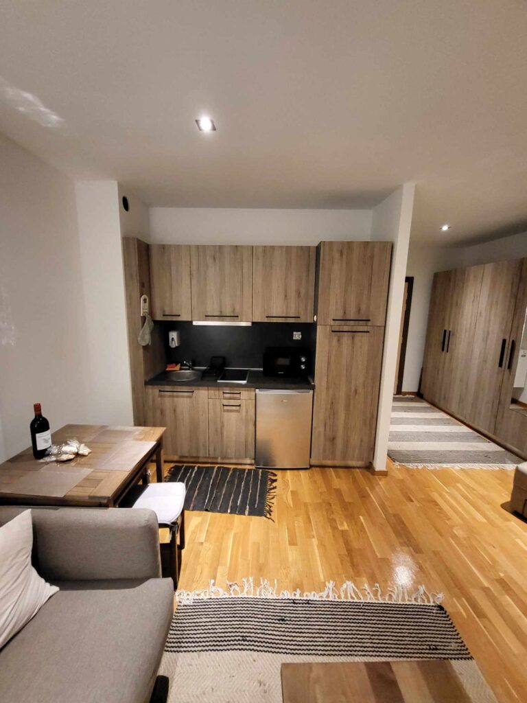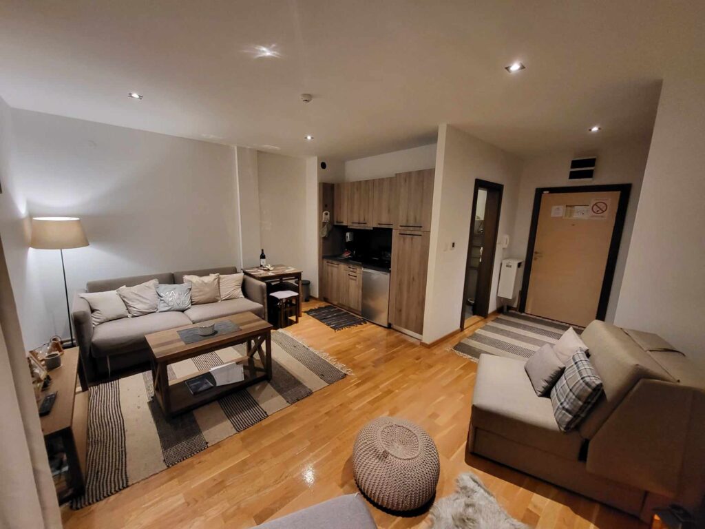Nalazi se na prvom spratu u toploj zgradi sa liftom koja se redovno održava. Zgrada "živi" cele godine jer stalno ima gostiju. Poseduje recepciju, profesionalnog upravnika koji radi na recepciji, uvek ima nekog da o zgradi i stanu vodi računa.