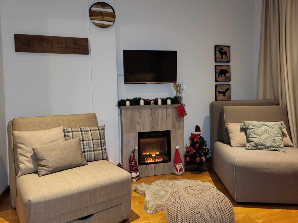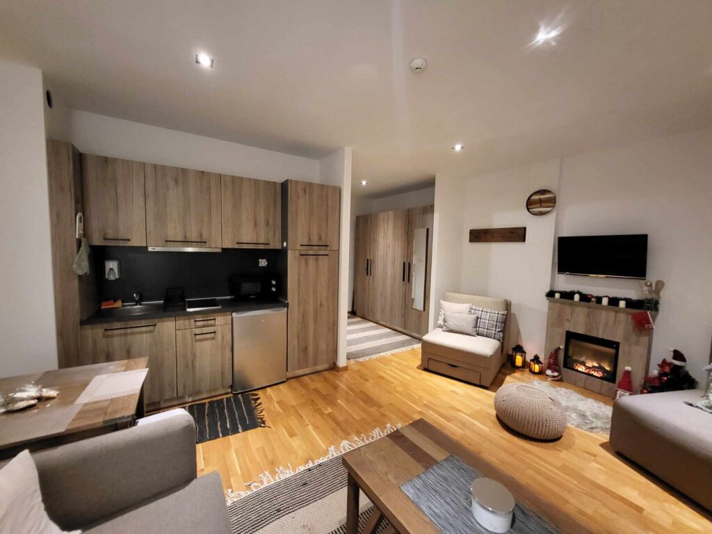 Stan je potpuno opremljen pa se u njemu može i živeti! od uređaja u stanu se nalazi bojler, ugradni fen, toster, kuvalo za vodu, frižider, dve ringle za kuvanje, aspirator, TV, kamin koji može grejati ili samo doprineti užitku u planinskom ambijentu, pegla, sef. Kuhinja je potpuno opremljena sudovima, čašama i šoljama, tanjirima u različitim oblicima i priborom za jelo. Zidovi su ukrašeni slikama, motivima životinja i satom. Stan je opremljen sa jednim velikim krevetom koji se razvlači i dva singl ležaja koji se razvlače. jedan komplet posteljine dolazi u stanu. Još postoji masivan manji dnevni sto, veći sto za ručavanje sa 4 stolice i polica koja može služiti za knjige i ukrase. U hodniku je veliki ormar.