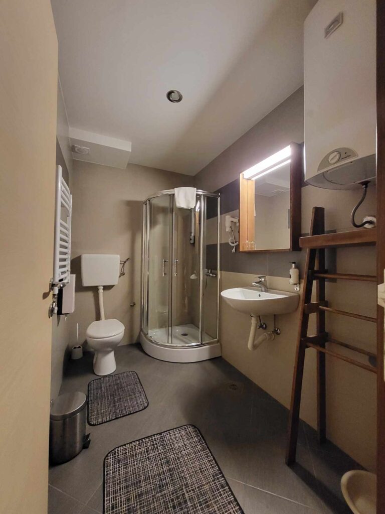 Kupatilo, pored nabrojane tehnike, ima tuž kabinu, lavabo sa većim ogledalom. Grejanje u kupatilu je etažnim grejanjem, sušilica je povezana u sistem grejanja.