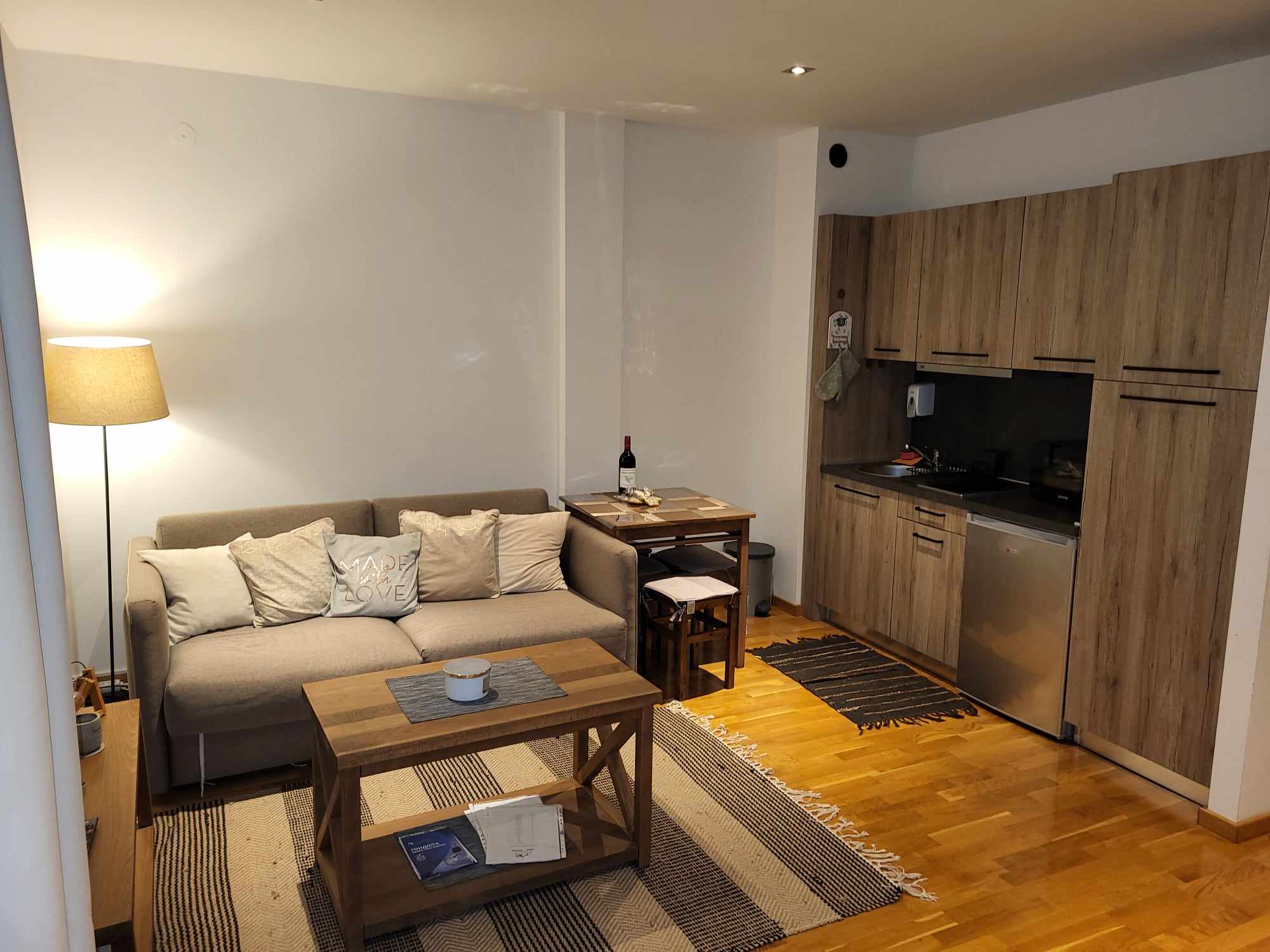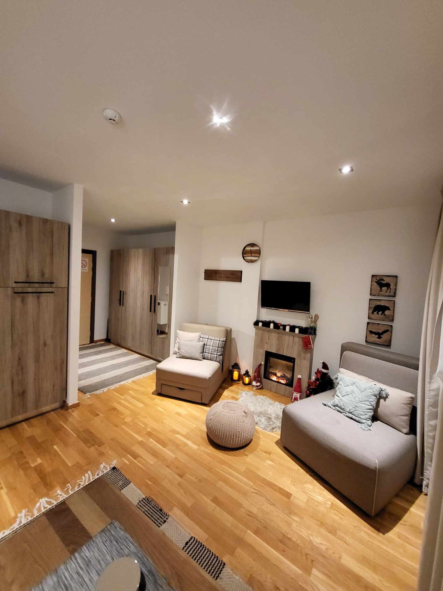 Stan je potpuno opremljen pa se u njemu može i živeti! od uređaja u stanu se nalazi bojler, ugradni fen, toster, kuvalo za vodu, frižider, dve ringle za kuvanje, aspirator, TV, kamin koji može grejati ili samo doprineti užitku u planinskom ambijentu, pegla, sef. Kuhinja je potpuno opremljena sudovima, čašama i šoljama, tanjirima u različitim oblicima i priborom za jelo. Zidovi su ukrašeni slikama, motivima životinja i satom. Stan je opremljen sa jednim velikim krevetom koji se razvlači i dva singl ležaja koji se razvlače. jedan komplet posteljine dolazi u stanu. Još postoji masivan manji dnevni sto, veći sto za ručavanje sa 4 stolice i polica koja može služiti za knjige i ukrase. U hodniku je veliki ormar.